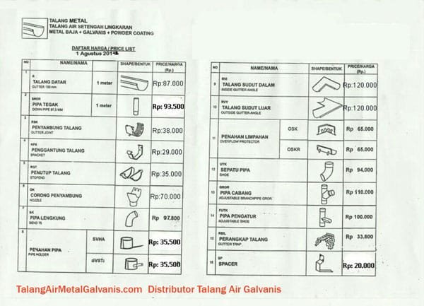 | Jenis Talang Air Metal | Harga per Meter (Rp) | Keterangan |